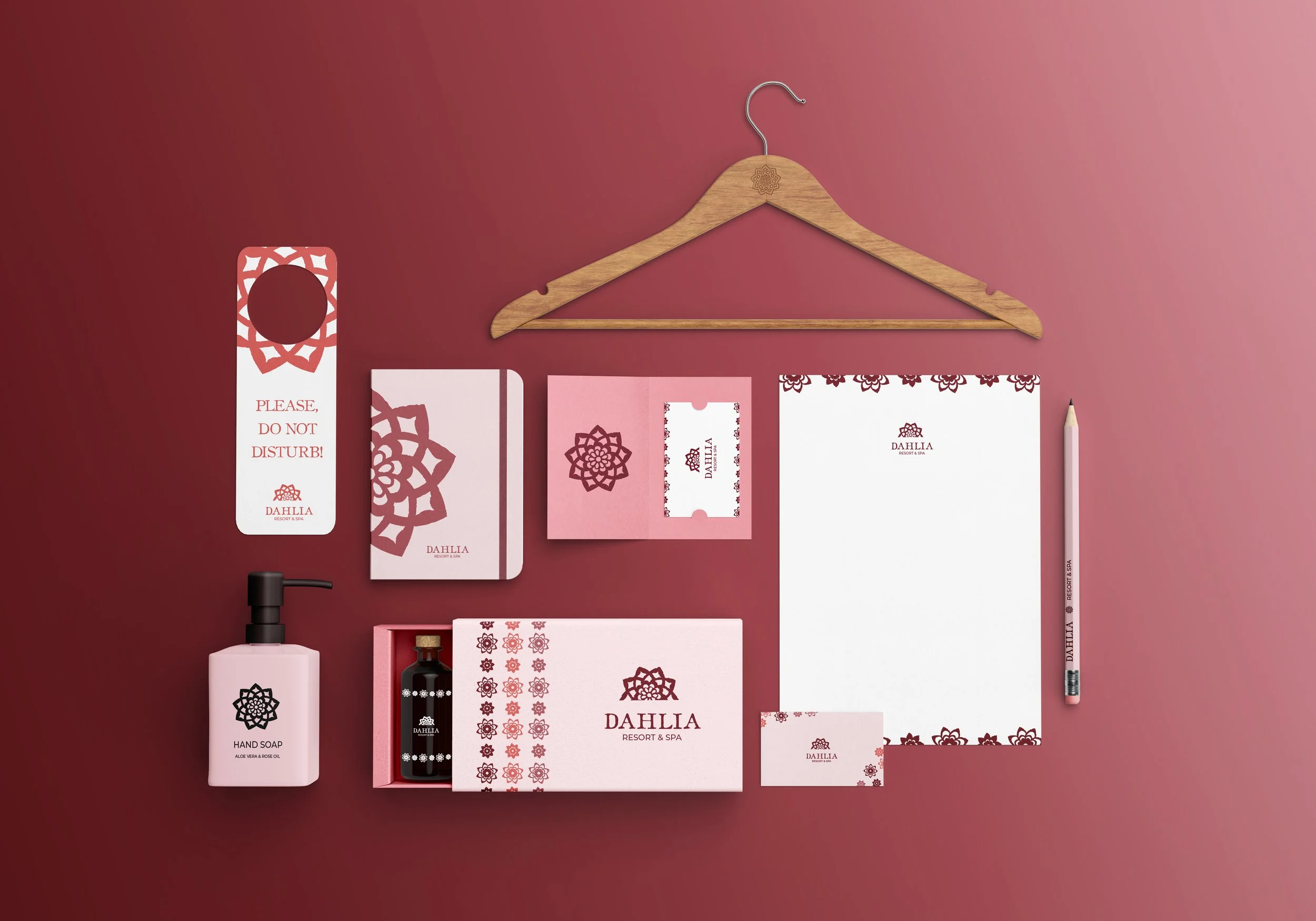 Concept is for an extremely luxurious resort based on Mexican beaches, and the National flower of Mexico — Dahlias. Dahlias are beautiful, geometric flowers, with layers upon layers of petals, their colors warm and saturated. This Resort’s brand inspiration came from the warmth of these botanical beings, as well as organic, tangible textures from these flowers and Mexican folk.